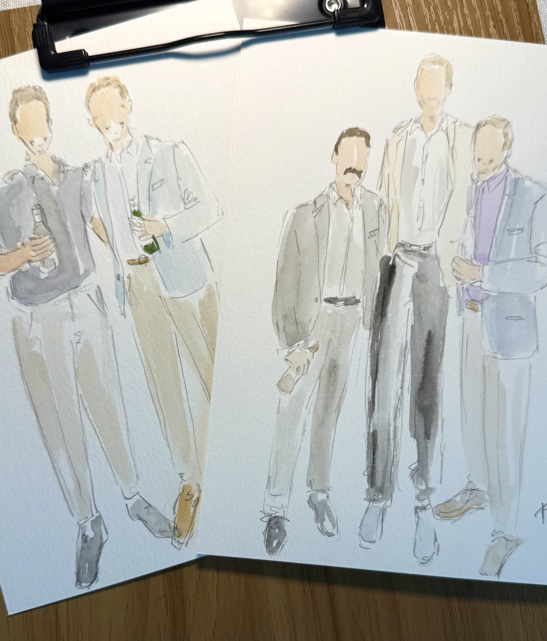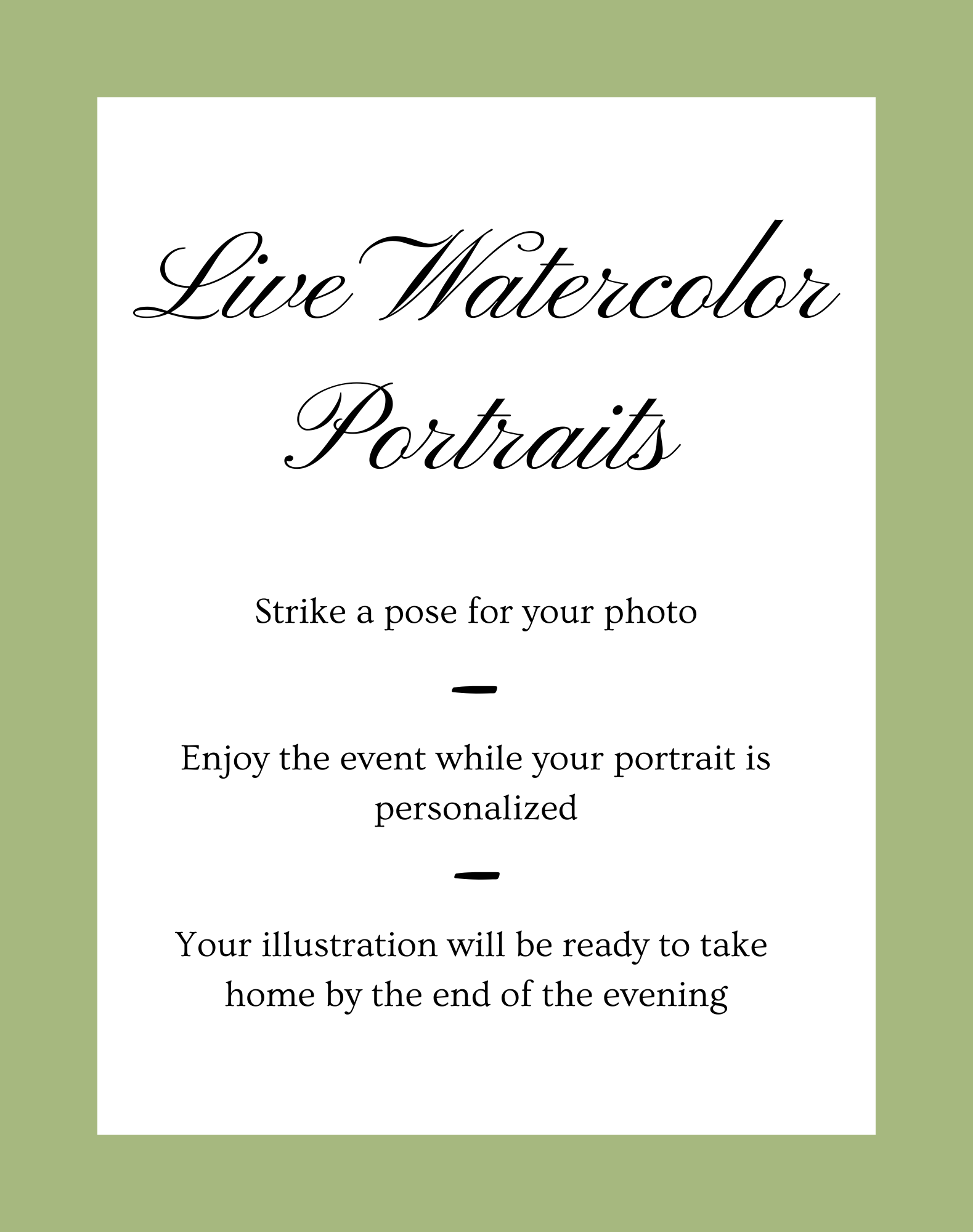 I arrive 1 - 1.5 hours prior to the scheduled start time. As soon as your guests begin to arrive, I capture their photo and begin illustrating.
